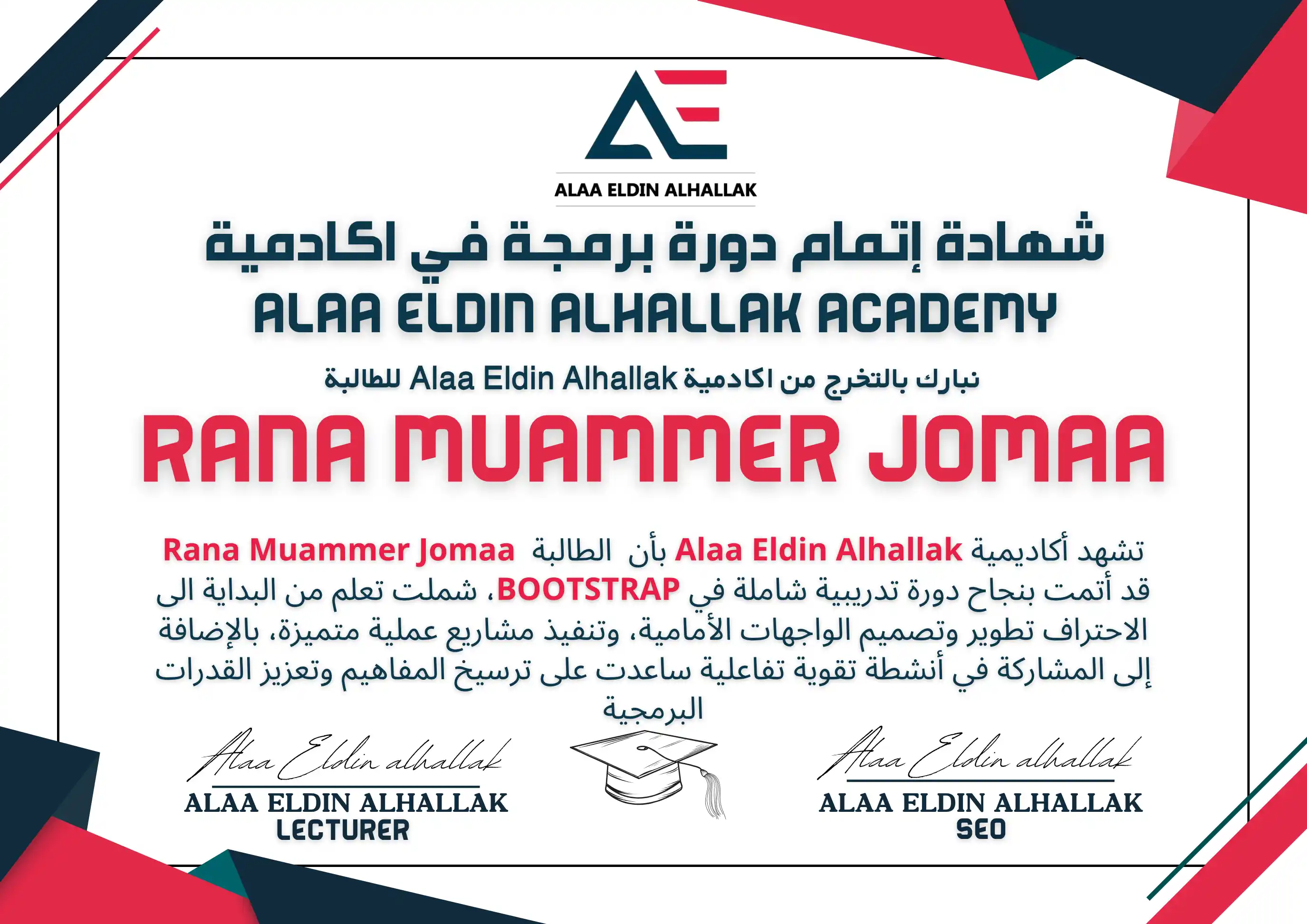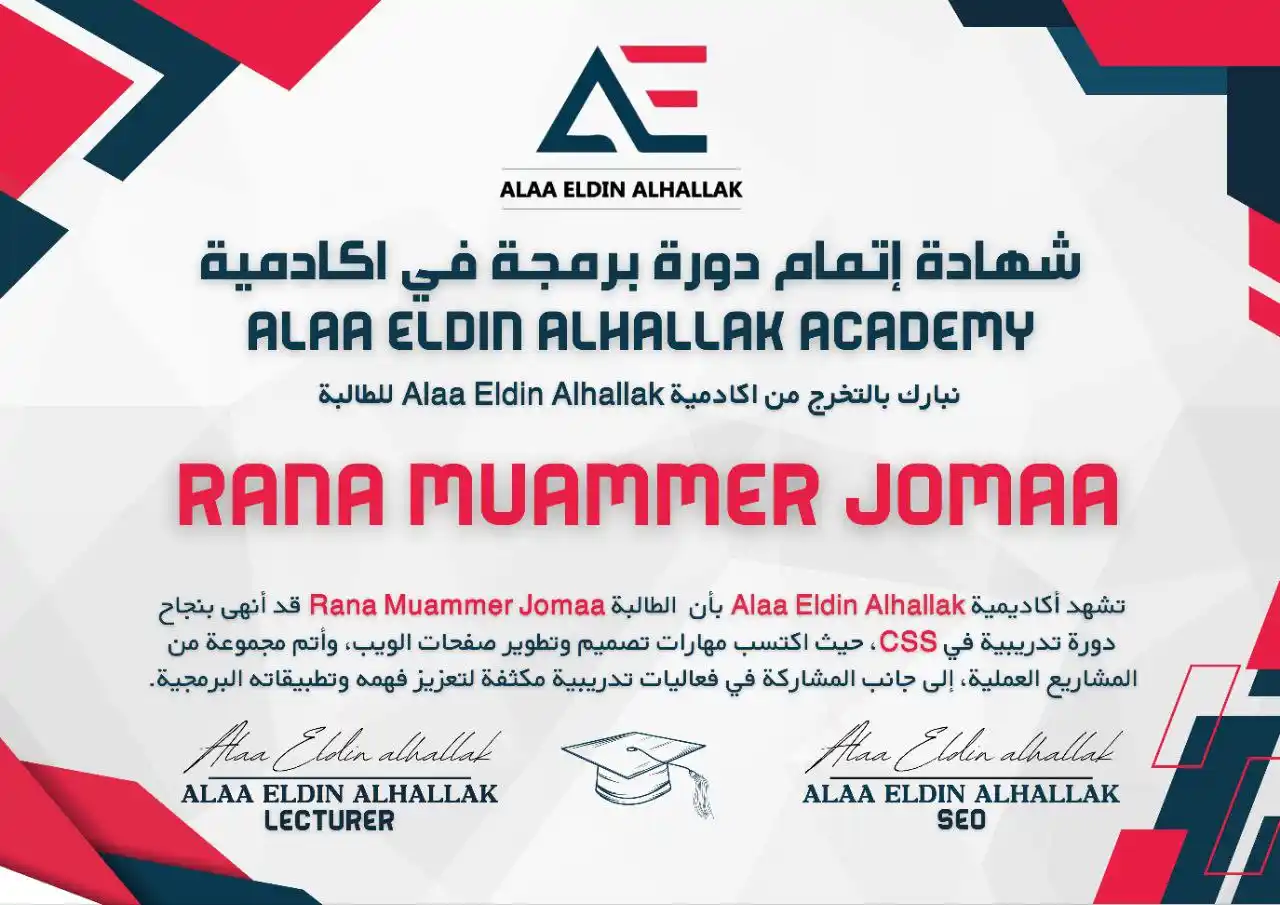 Certified Front-End & React Developer – Trained at Alaa Al-Din Al-Hallak Academy.