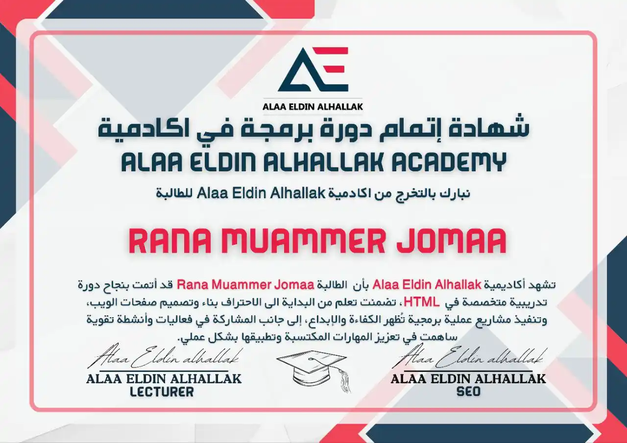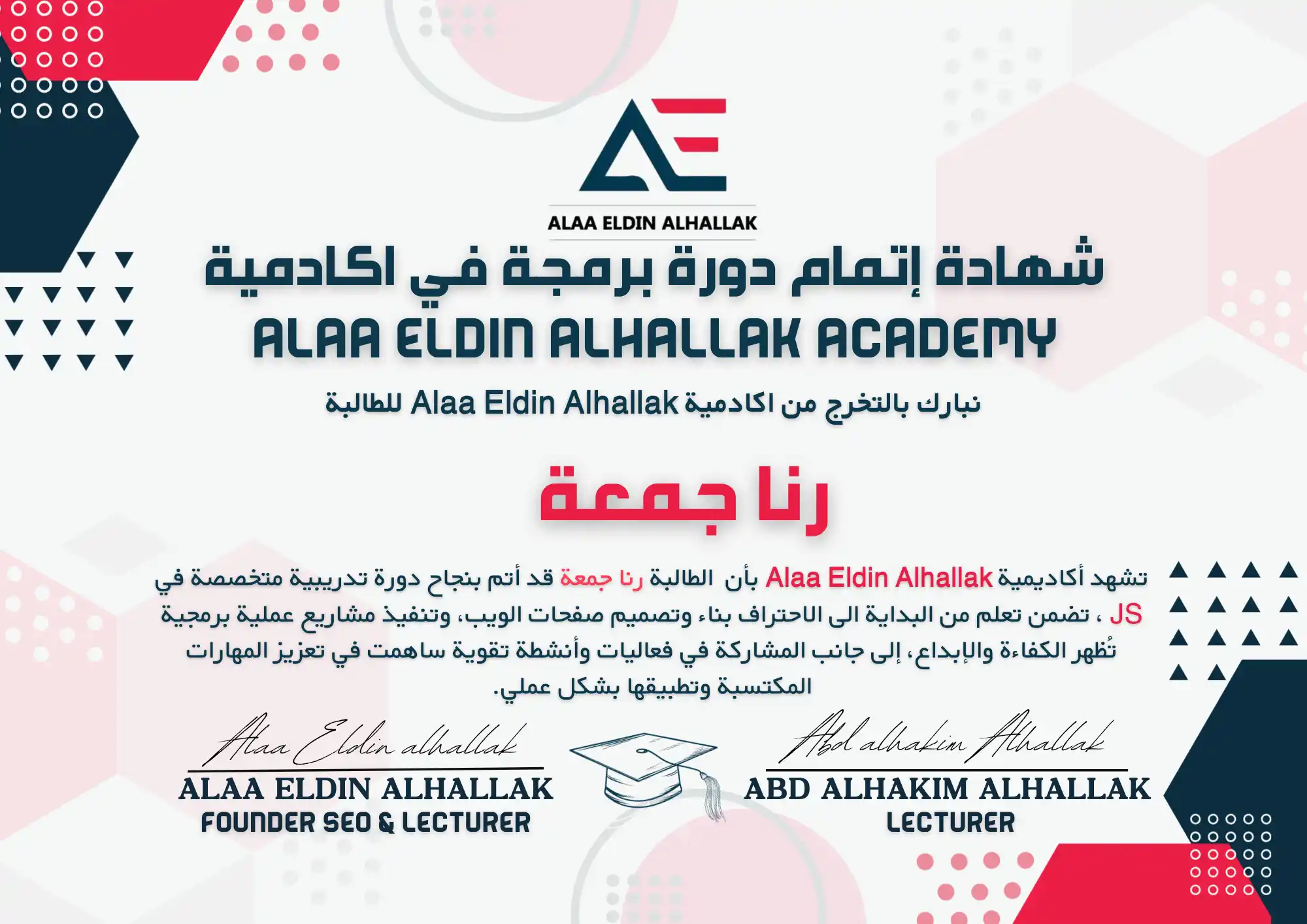 Certified Front-End & React Developer – Trained at Alaa Al-Din Al-Hallak Academy.